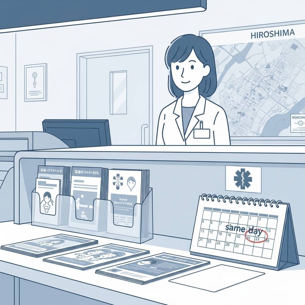 広島市内で即日アフターピルを入手できる主な医療機関には、「ひろしまレディースクリニック」「広島中央クリニック」「八丁堀女性クリニック」などがあります。多くの医療機関では、予約制を採用していますが、緊急時には当日受付も対応してくれるところもあります。